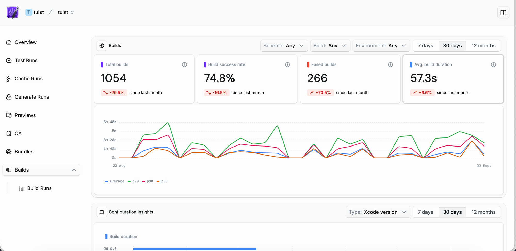 As I said, we are evolving Tuist to be more of an extension that you plug into your Xcode project and toolchain. It's an extension that takes just a few lines to integrate. For instance, if you want to get build insights like those that we get for the Tuist project, all you need to do is add a post-action to your Xcode project scheme, and you are good to go. Or selective testing, which you can adopt in your Xcode projects by just prefixing your xcodebuild invocation with tuist. Now, you might not want to depend on or even pay for third-party tools, and I'd understand that too, but once your project reaches a certain scale, I'll tell you that you'll experience a regression in developer experience that Apple won't support you with, and you'll be alone there. I've seen that many times, and it was hard for developers. From companies adopting React Native to others replacing the build system entirely, the pain was much stronger than the little cost that a non-official abstraction like Tuist could have brought to your project.
